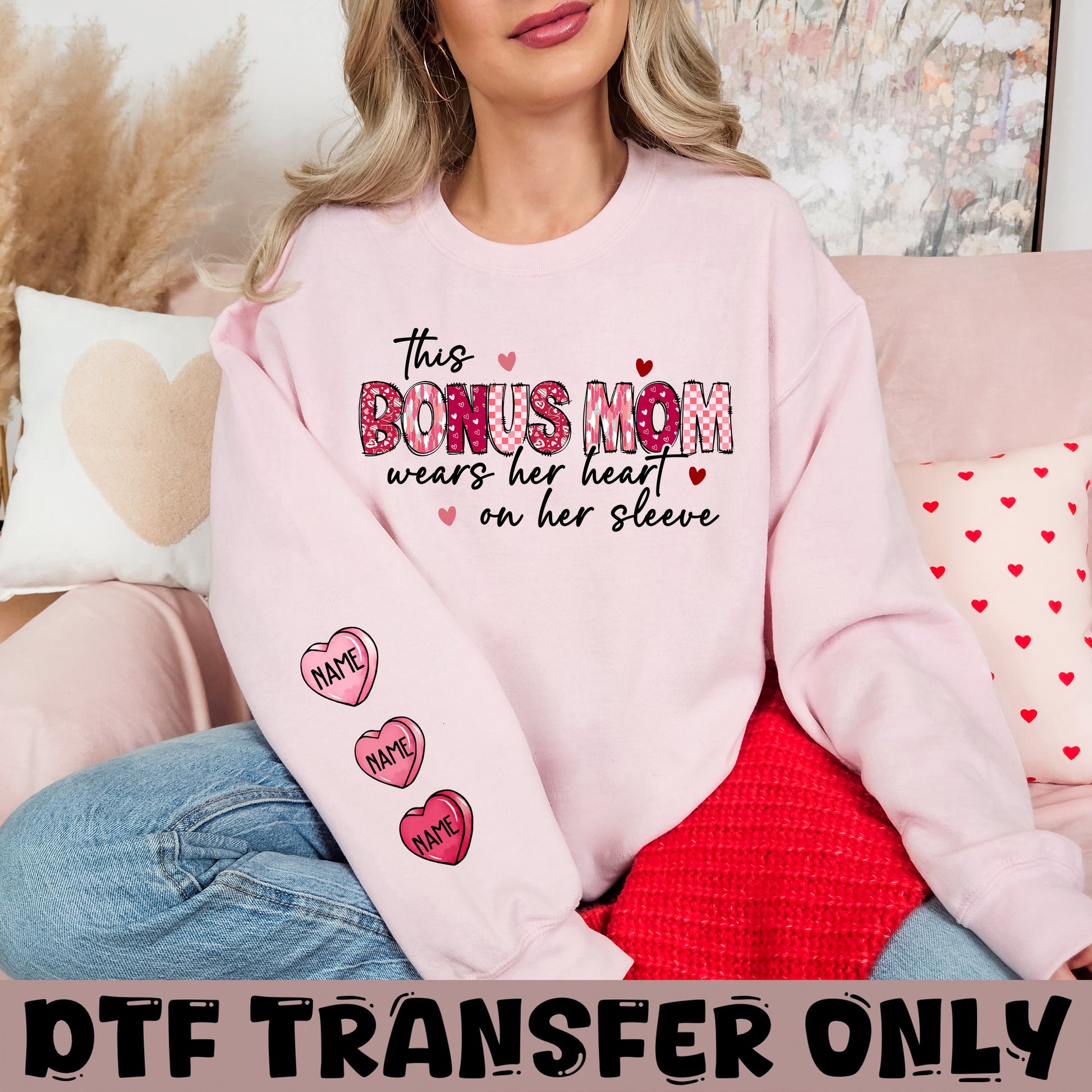 This Bonus Mom wears her heart on her Sleeves DTF Transfer